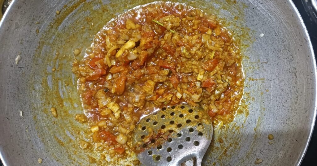 त्यामध्ये कांदा तांबूस रंगावर परतून घ्या. आता त्यामध्ये टोमॅटोही परतून घ्या. कांदा टोमॅटो परतल्यानंतर अद्रक लसूण मिरचीची पेस्ट त्यामध्ये घाला आणि तेही परतवून घ्या.