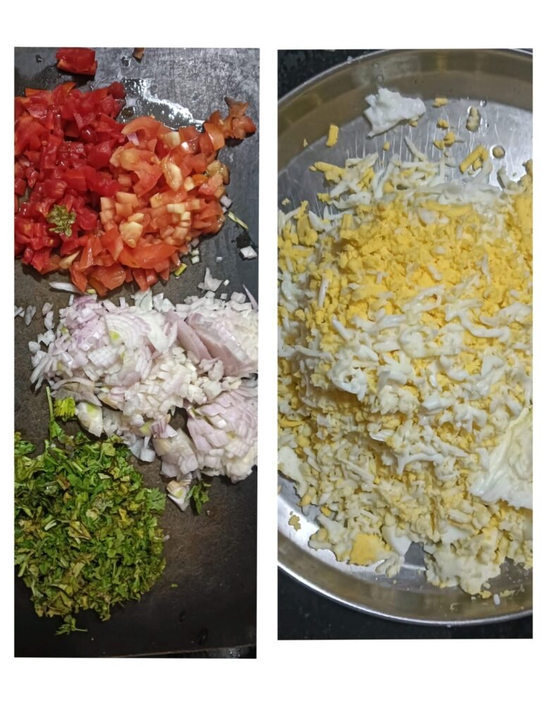 आता हे सोललेले अंडे त्याचा किसणीवर किस करून घ्या. एका साईडला बारीक कांदा चिरून घ्या. टोमॅटो ही बारीक चिरून घ्या.