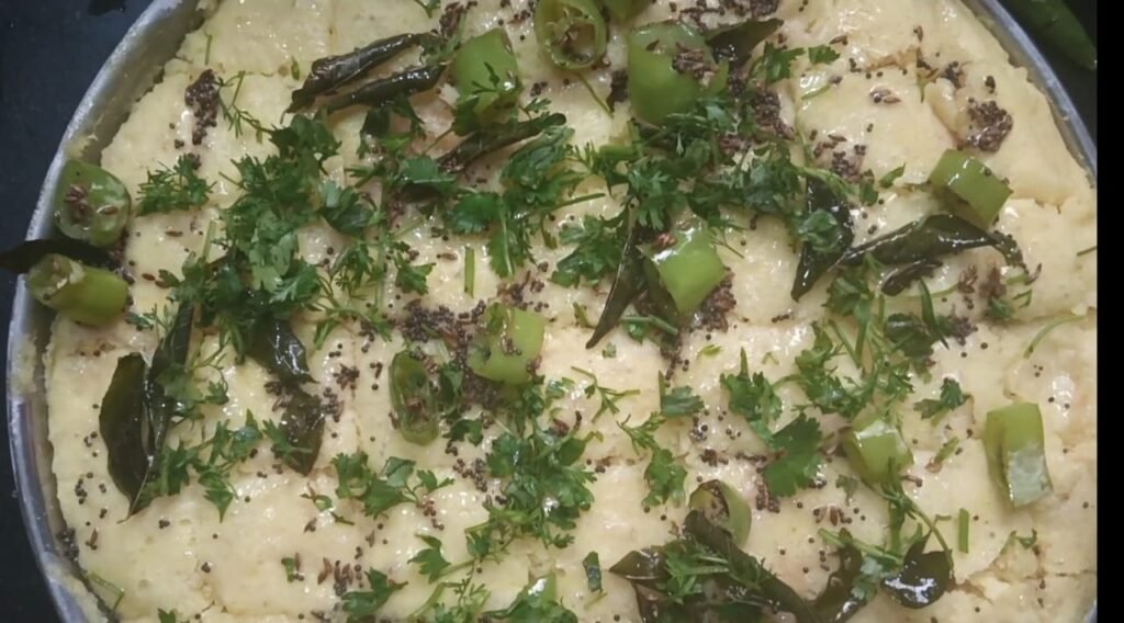 आता हे फोडणीचे तेल ढोकळ्याच्या ताटावर घाला आणि चिरलेली कोथिंबीर घाला… आपल्या ढोकळ्यांना चांगला स्पंज आलेला…