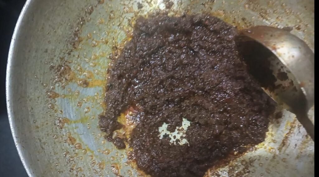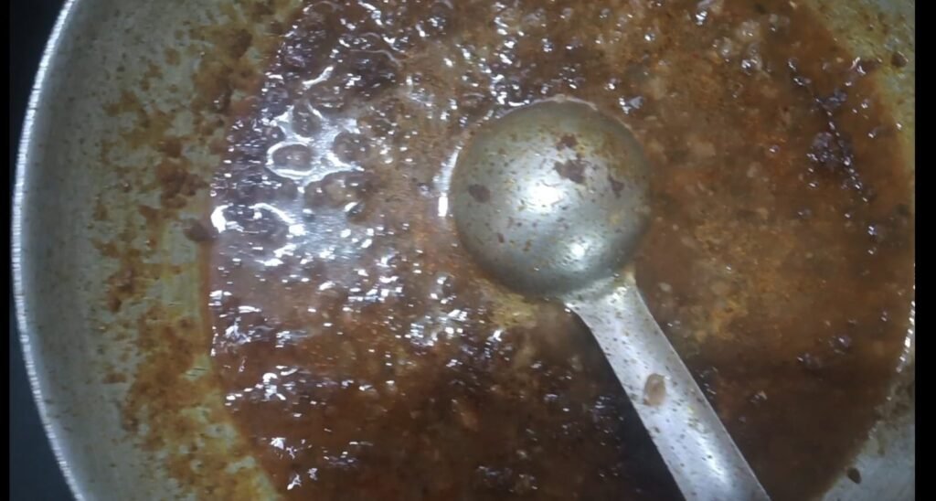 की त्यामध्ये जिरे मोहरी घाला त्यानंतर चटणी घाला… चटणी मध्ये पाव चमचा हळद एक चमचा तिखट एक चमचा धनापूर आणि अर्धा चमचा गरम मसाला घालून चटणी चांगली तेल सुटेपर्यंत व्यवस्थित परतून घ्या…