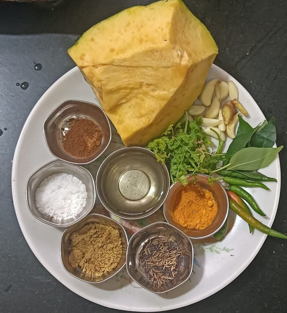 पाव किलो लाल भोपळा (गंगाफळ), पाच हिरवी मिरची छ लसूण पाकळी अर्धा इंच आले तुकडा, कढीपत्ता कोथींबीर, हळद, गरम मसाला मीठ चवीप्रमाणे धना पूड, जीरे मोहरी, टेबलस्पून तेल,