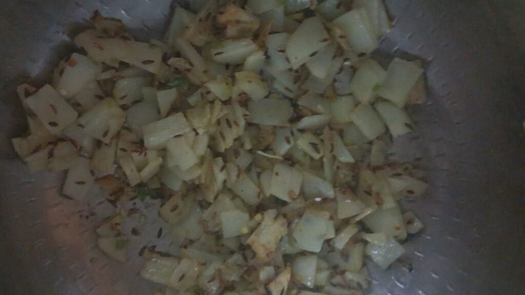 आता एका कढईमध्ये कडकडीत तेल गरम करा. कडकडीत तेल गरम झाल्यानंतर त्यामध्ये जिरे घाला. जिरे तडतडल्यानंतर त्यामध्ये बटाट्याचे काप घाला.