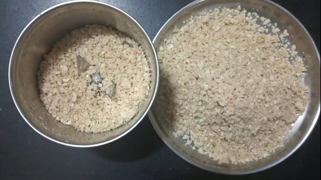 त्यानंतर याप्रमाणे थोड्या थोड्या पोळ्यांचे तुकडे घालून मिक्सरमध्ये जाडसर भरडा करून घ्या. आता एका भांड्यामध्ये हा भरडा काढून घ्या.