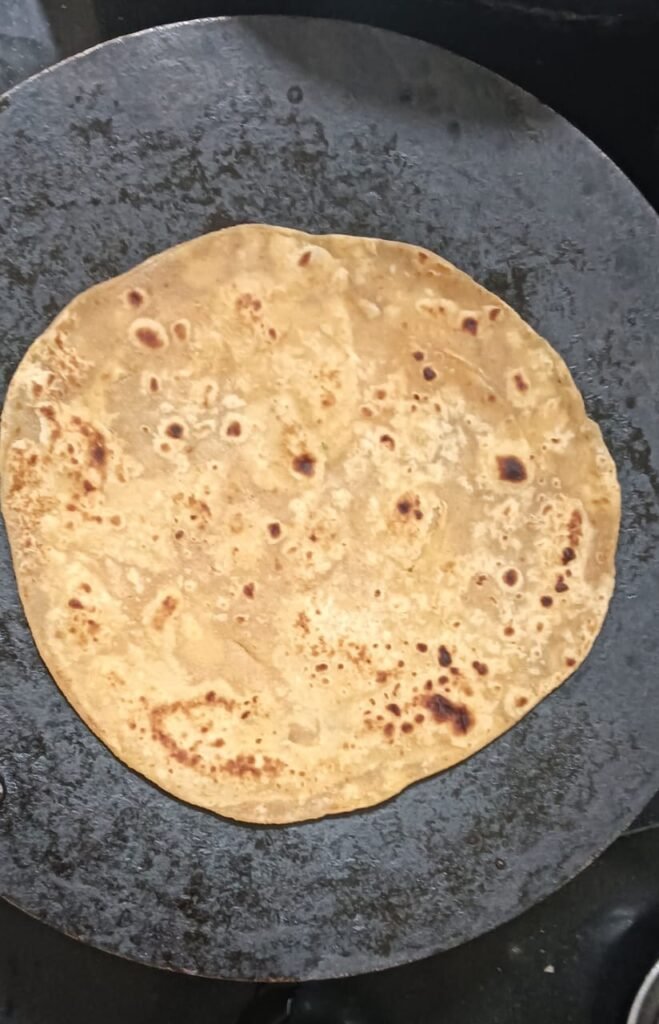 त्याप्रमाणे गोळा करून पोळी लाटून घ्या. तवा गरम करून घ्या त्यावर लाटलेली पोळी शिकून घ्या त्या पोळीला दोघ बाजूने सराट्याच्या साह्याने तेल लावून घ्या.