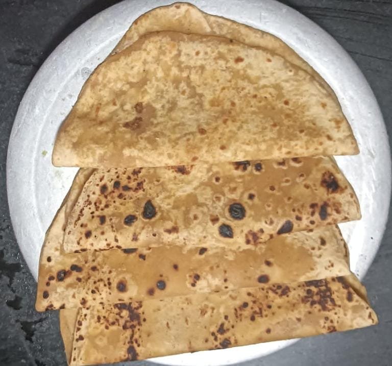 त्याप्रमाणे गोळा करून पोळी लाटून घ्या. तवा गरम करून घ्या त्यावर लाटलेली पोळी शिकून घ्या त्या पोळीला दोघ बाजूने सराट्याच्या साह्याने तेल लावून घ्या.