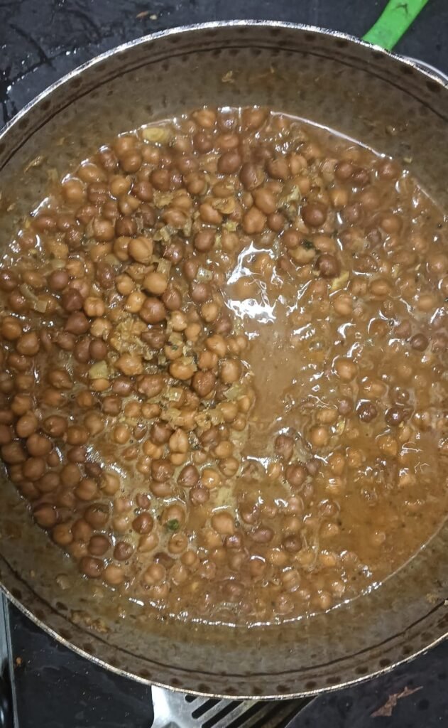 आता एका कुकरमध्ये हरभरे घालून त्यामध्ये शिजतील तिप्पट पोळ्याचे पाणी घालावे. आणि कुकरच्या दहा ते पंधरा शिट्ट्या होईल इथपर्यंत शिजवावे.