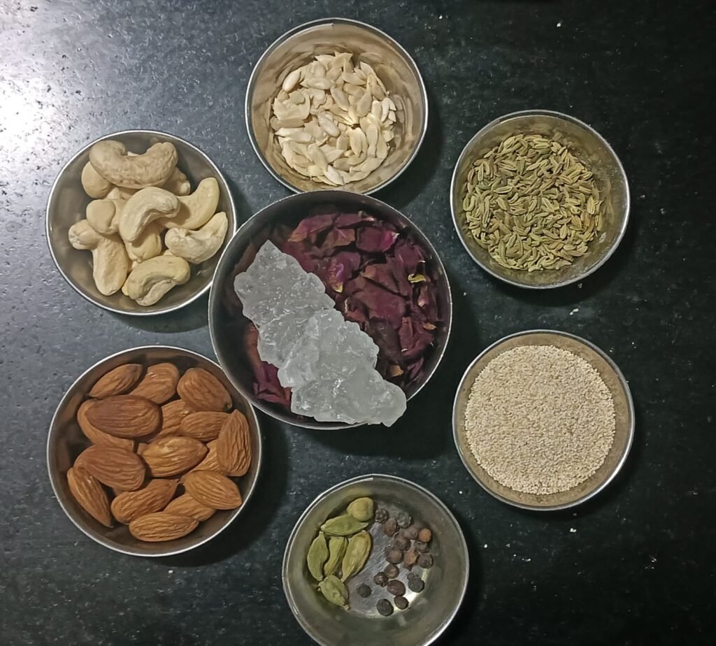 एक लहान वाटी बदाम (२ टेबल स्पून १२) एक लहान वाटी काजू (१ १/२टेबल स्पून ८) मेलन सीड( १ १/२ टेबल स्पून) १ चमचा शोप २ टेबल स्पून खसखस दहा ते बारा सहा हिरवे वेलदोडे साबूत अर्धी वाटी गुलाब पाकळ्या एक मोठा खडा खडीसाखरेचा एक ग्लास दूध