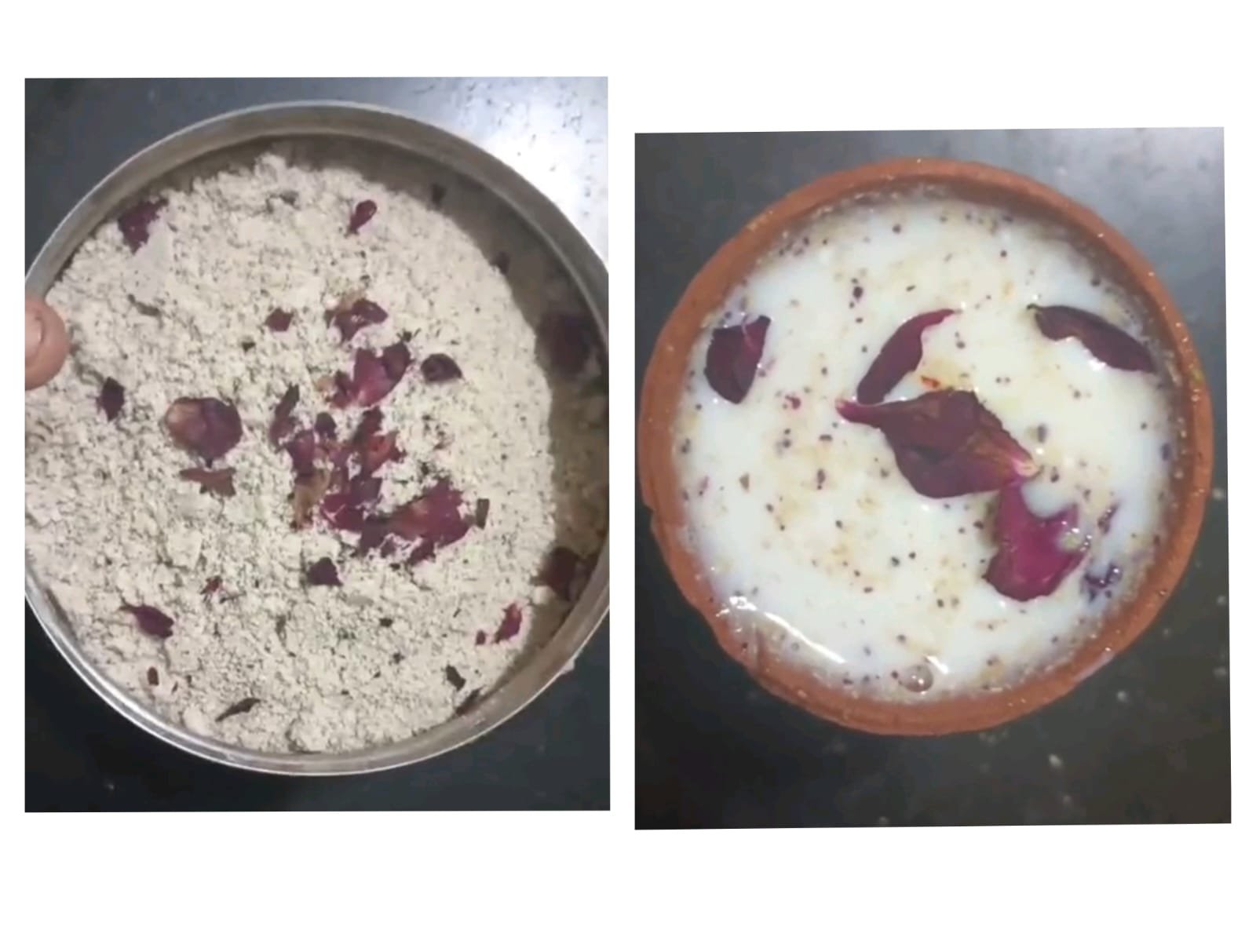 एक लहान वाटी बदाम (२ टेबल स्पून १२) एक लहान वाटी काजू (१ १/२टेबल स्पून ८) मेलन सीड( १ १/२ टेबल स्पून) १ चमचा शोप २ टेबल स्पून खसखस दहा ते बारा सहा हिरवे वेलदोडे साबूत अर्धी वाटी गुलाब पाकळ्या एक मोठा खडा खडीसाखरेचा एक ग्लास दूध