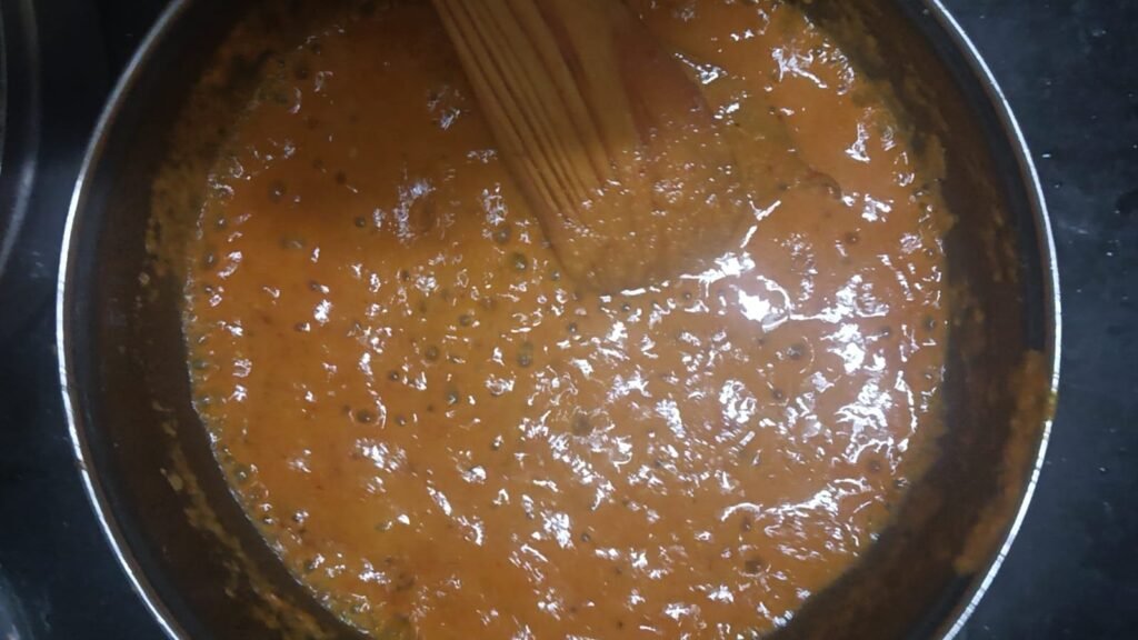 पॅनमध्ये पुन्हा तेल गरम करून घ्या त्यात जिरे मोहरी घाला एक तेजपान घालून चांगले परतवून घ्या. त्यानंतर आपण तयार केलेली चटणी त्यामध्ये घाला.
