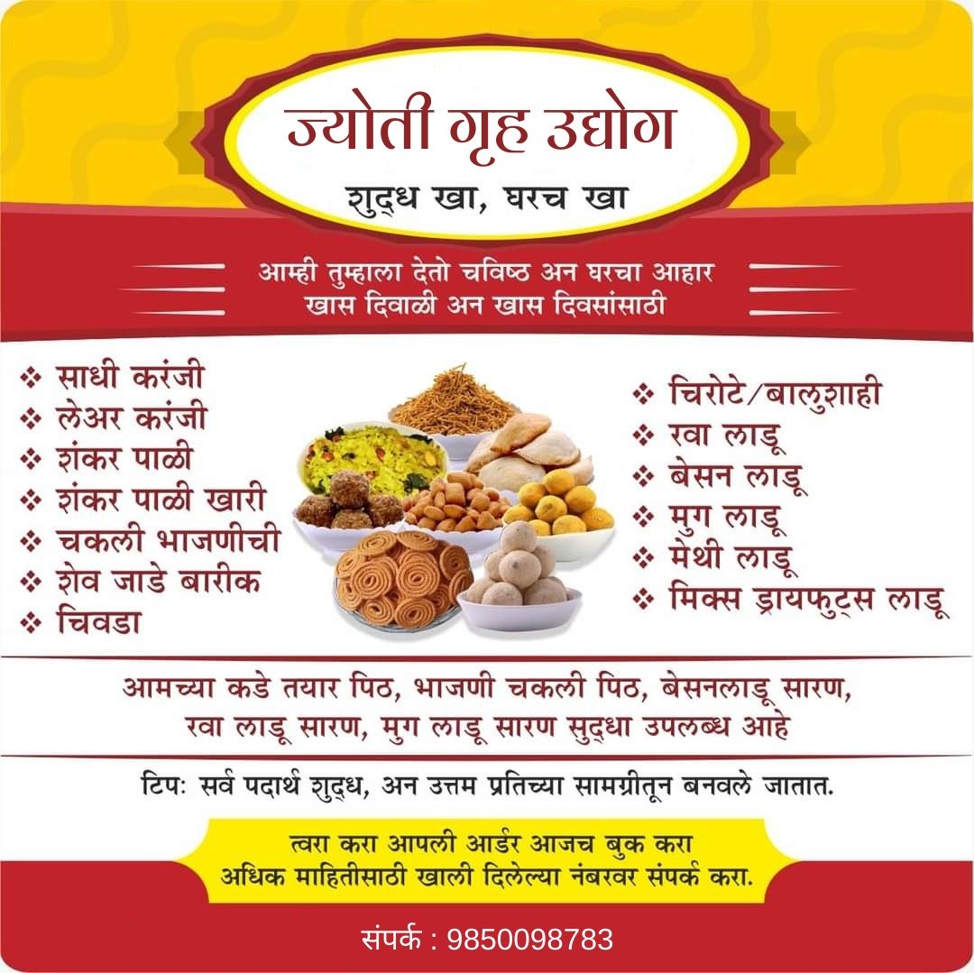 आपल्या धावपळीच्या जीवनात उत्सव साजरे करताना.. आपल्याला घरगुती, रुचकर फराळाचा वेळेवर आस्वाद घेता यावा, यासाठी आम्ही घरगुती, रूचकर व आपल्याला परवडेल अश्या दरामध्ये, साजूक तूपातील व रिफाईंड तेलात आणि स्वच्छ वातावरणात बनविल्या जातात.