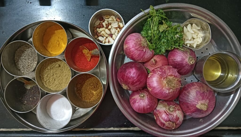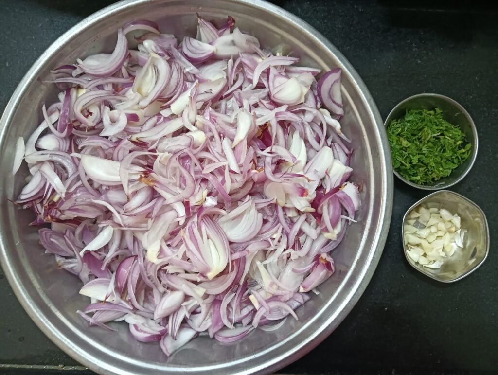 सर्वप्रथम कांदे व्यवस्थित सोलून घ्या… कांदे सोडल्यानंतर कोंबडा कांदा कापून घ्या.. कोंबडा कांदा म्हणजे कांदे हे मधून दोन तुकडे करून लांबोळक्या आकाराने कापून घ्या….