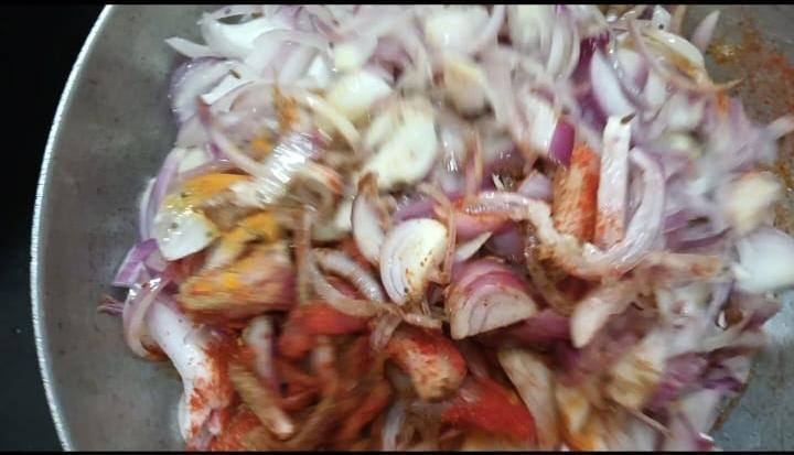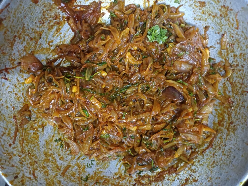 कांद्याचे लांबी काप घातल्यानंतर त्यामध्ये अर्धा चमचा हळद एक चमचा तिखट अर्धा चमचा गरम मसाला अर्धा चमचा धनापुड घालून कांदा व्यवस्थित एकत्र करून घ्या….