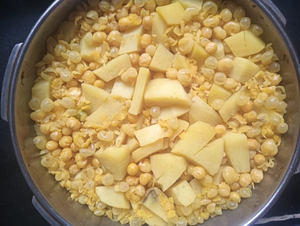 त्यानंतर सकाळी वाटाणे कुकरमध्ये घालताना धुवून घ्यायचे आहे… धुतल्यानंतर बटाटे सोलून घ्या… बटाट्याची साल काढून घ्या आणि त्याचे काप करून घ्या…