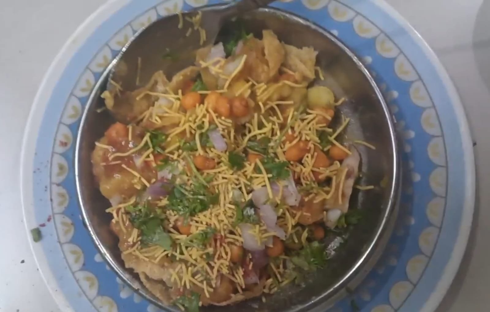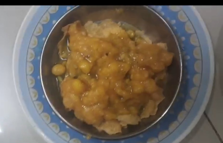 त्यावर चिंचेचे आंबट गोड पाणी घाला… त्यावर तिखट बुंदी घाला… बारीक शेव घाला बारीक चिरलेला कांदा घाला आणि कोथिंबीर घाला…
