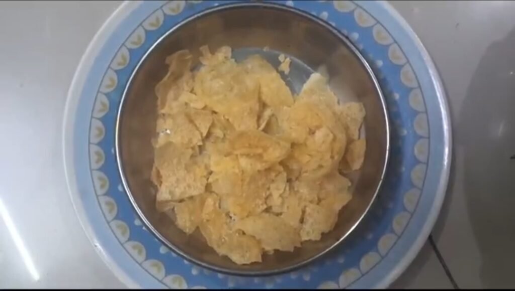 आता एका डिश मध्ये पाणीपुरीच्या पुऱ्या थोड्या चुरून घ्या… सुरल्यानंतर त्यावर गरमागरम असा रगडा घाला…