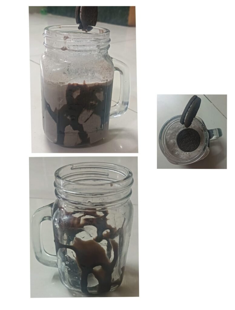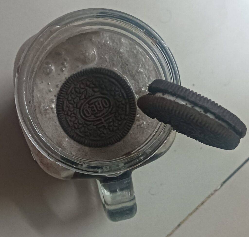 आता त्यामध्ये आपण तयार केलेले ओरिओ चे मिश्रण घाला. त्यावर गार्निशिंग म्हणून एक आपण ठेवलेले बिस्किट घाला.