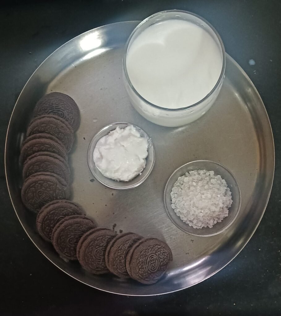 दोन ओरिओ बिस्किटचे पुडे घ्या. पांढरा रंगाची क्रीम बाजूला काढा. दोन बिस्किटे गार्निशिंग साठी बाहेर काढून ठेवा.