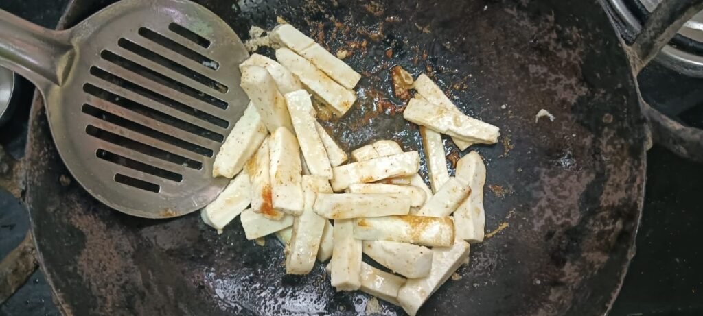 आता एका कढईमध्ये आपण तेल घालून त्यामध्ये पनीरची जे आयताकृतीत काम केलेले आहे ते घालून त्यावर छान तिखट मीठ चवीप्रमाणे घालावे. पनीर चांगले खरपूस परतून घ्यावे.
