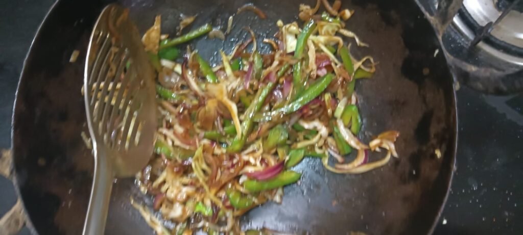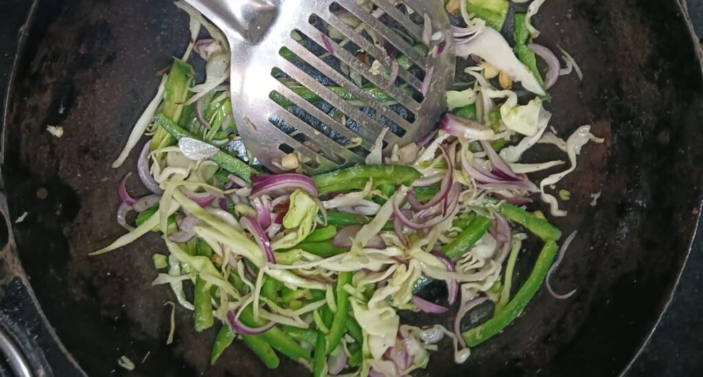 आता एका कढईमध्ये थोडे तेल गरम करा. तेल कडकडीत गरम झाले की लसणाचे काप अद्रकाचा कीस घालून परतून घ्या. - आता त्यामध्ये सिमला मिरची घालून परतून घ्यावे. पत्ताकोबी ही घालून परतून घ्यावे.