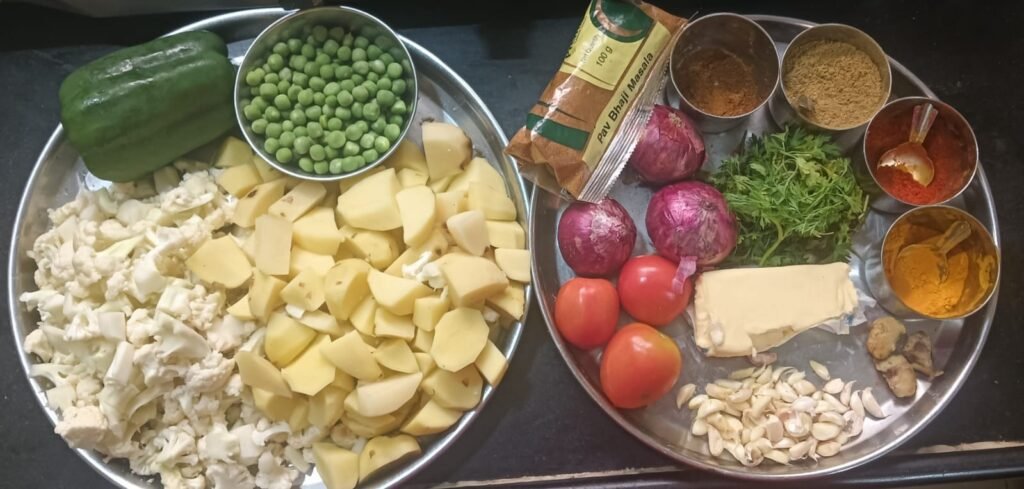 ९ लसून पाकळ्या, एक टेबलस्पून उकडलेल्या बटाटा वाटाण्याची पेस्ट, एक चमचा पावभाजी मसाला, मीठ, १ चमचा बटर, पावचमचा तिखट. कोथिंबीर