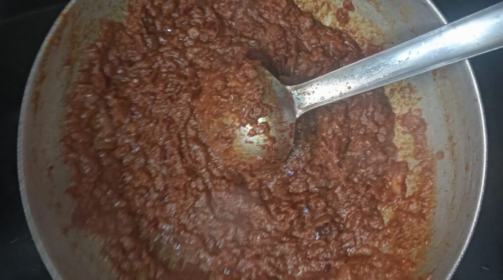 एका कढईमध्ये तेल गरम करून घ्या. त्यामध्ये चिरलेला कांदा परतवून घ्या. त्यामध्ये टोमॅटोची केलेली पेस्ट घाला. मिश्रण चांगले परतवून घ्या.