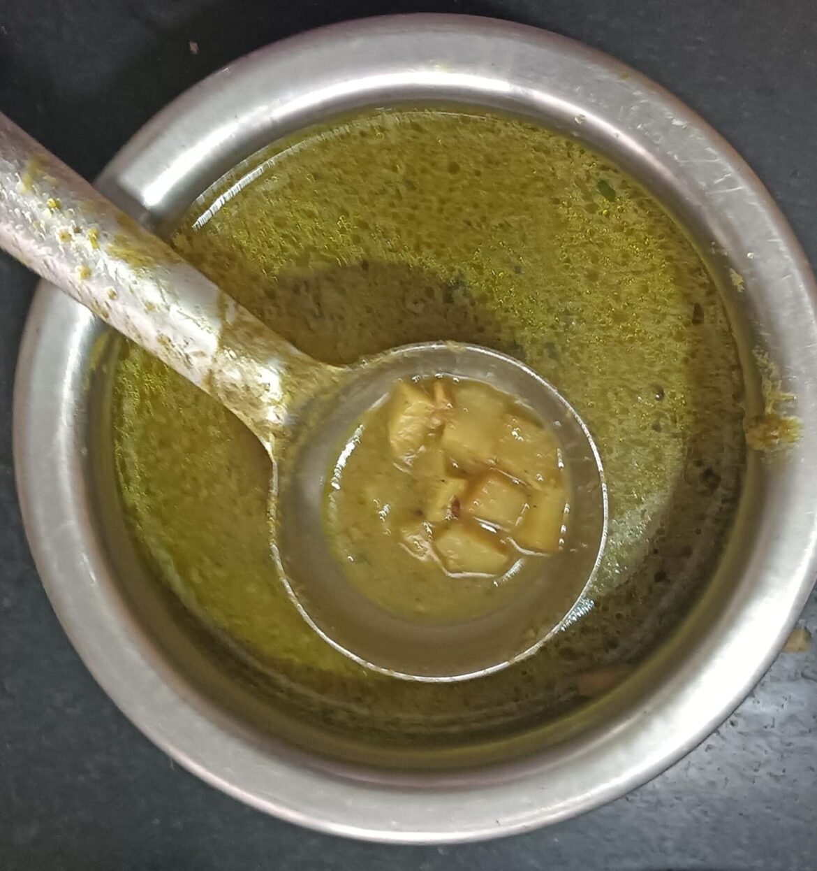 आणि हे पाणी परतवलेल्या चटणी आणि बटाट्याच्या मिश्रणामध्ये घाला. पाणी आपल्या गरजेप्रमाणे घालावे भाजी आपल्याला कितपत पातळ हवी याप्रमाणे ते घालावे.