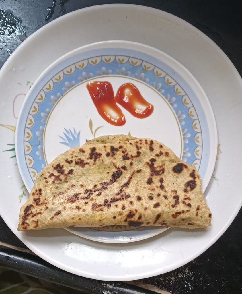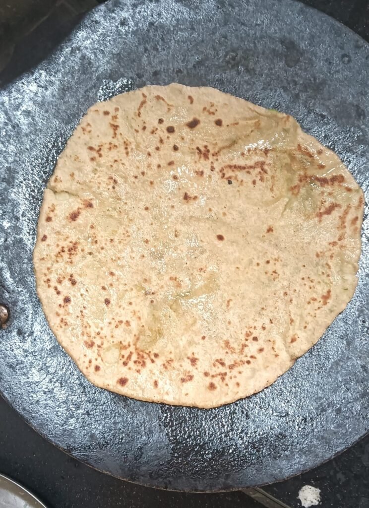पराठा तव्यावर घाला व दोन्ही बाजूंनी चांगला खरपूस शेकून घ्या. पराठ्याला दोन्ही बाजूस तूप लावा. ज्याला तू आवडत नसेल त्यांनी तेलही लावले चालेल.