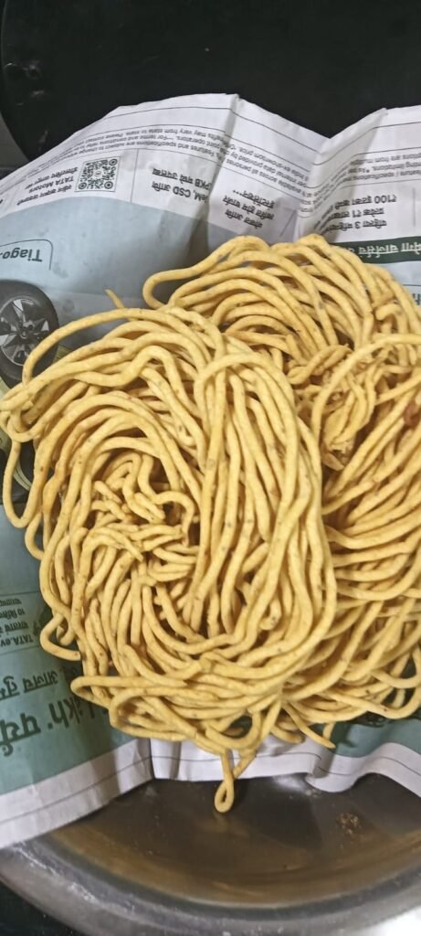 गॅसची आच अधून मधून कमी जास्त (मध्यम) आच करावी.. याप्रमाणे सर्व मिश्रणाची शेव तळून घ्या. शेव एका कागदावर पसरवून घ्या.