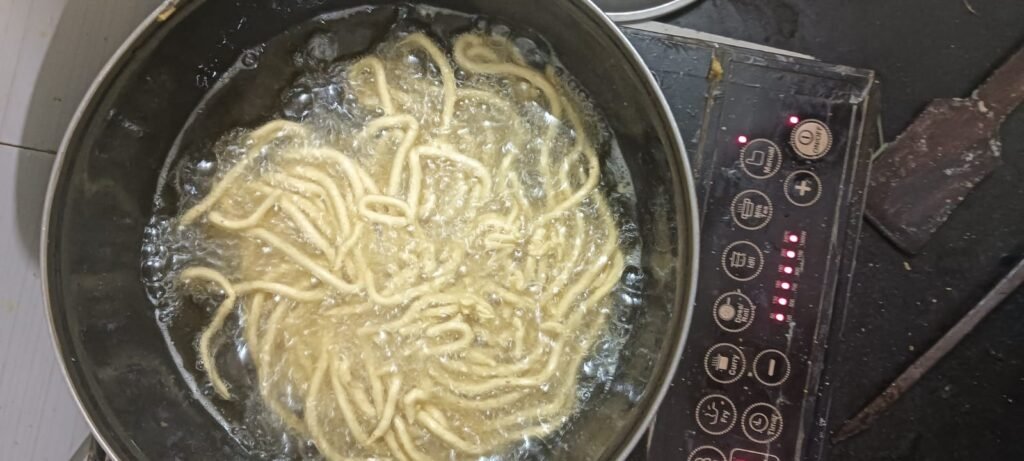 तेल कडकडीत गरम झाली का? हे बघा त्यामध्ये एक शेवाचा तुकडा टाका. तेल चांगले कडकडीत तापले की मग त्या शेवाची चकती गाळा.