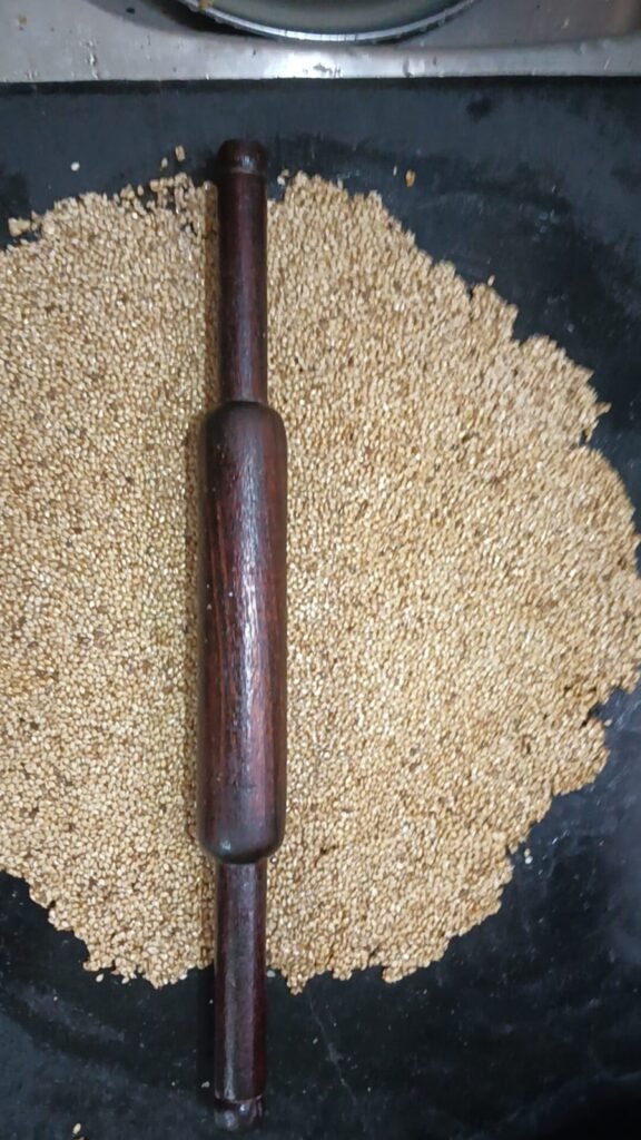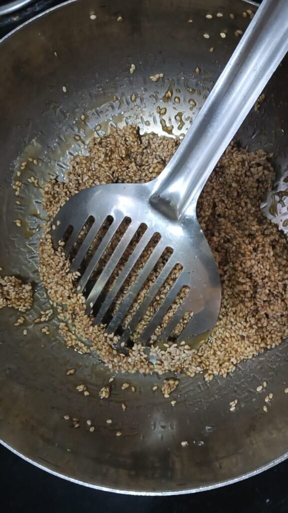 आता हे तीळ कढई गरम करून त्यामध्ये खरपूस अशी भाजून घ्या. म्हणजे त्यातील कचवटपणा निघून जाईल आणि त्याची वडी खमंग बनेल.