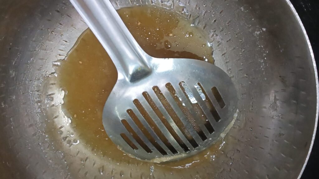 ही साखर सारखी परतवत राहा साखरेला पाणी सुटले की हळूहळू साखर वितळायला सुरुवात होईल. आणि साखरेचा पाक होईल. साखरेचा पाक थोडा तांबूस रंगाचा होईल. साखरेचा पाक जास्त पक्का करायचा नाही.
