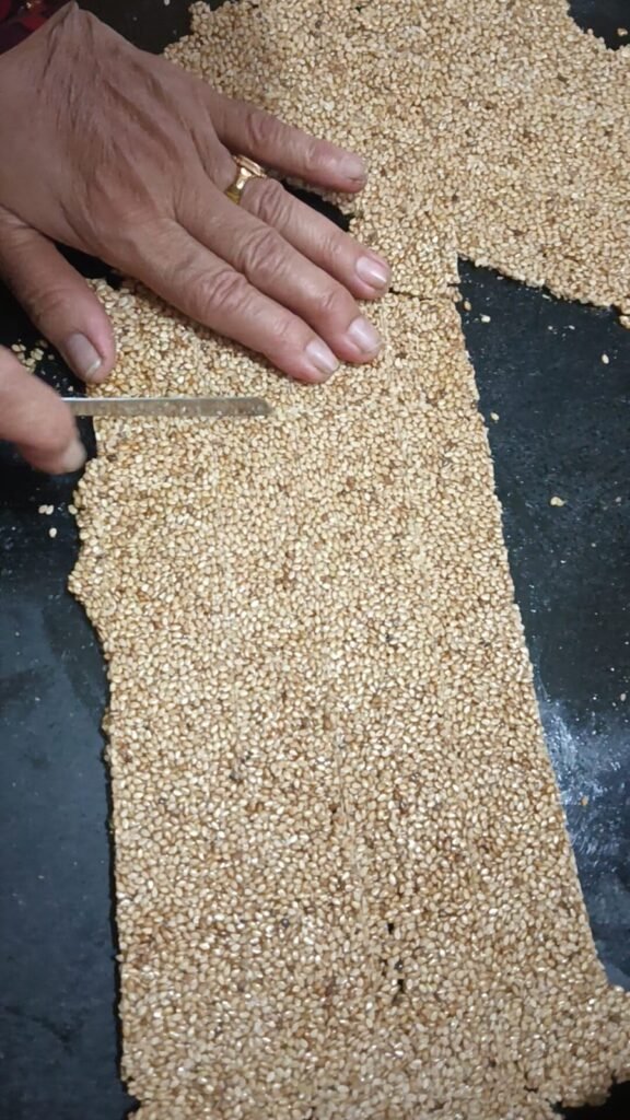 नाहीतर त्याची पुन्हा साखर तयार होईल. साखरेचे पाणी पूर्णपणे झाले की मग त्यामध्ये भाजलेले तीळ घाला.