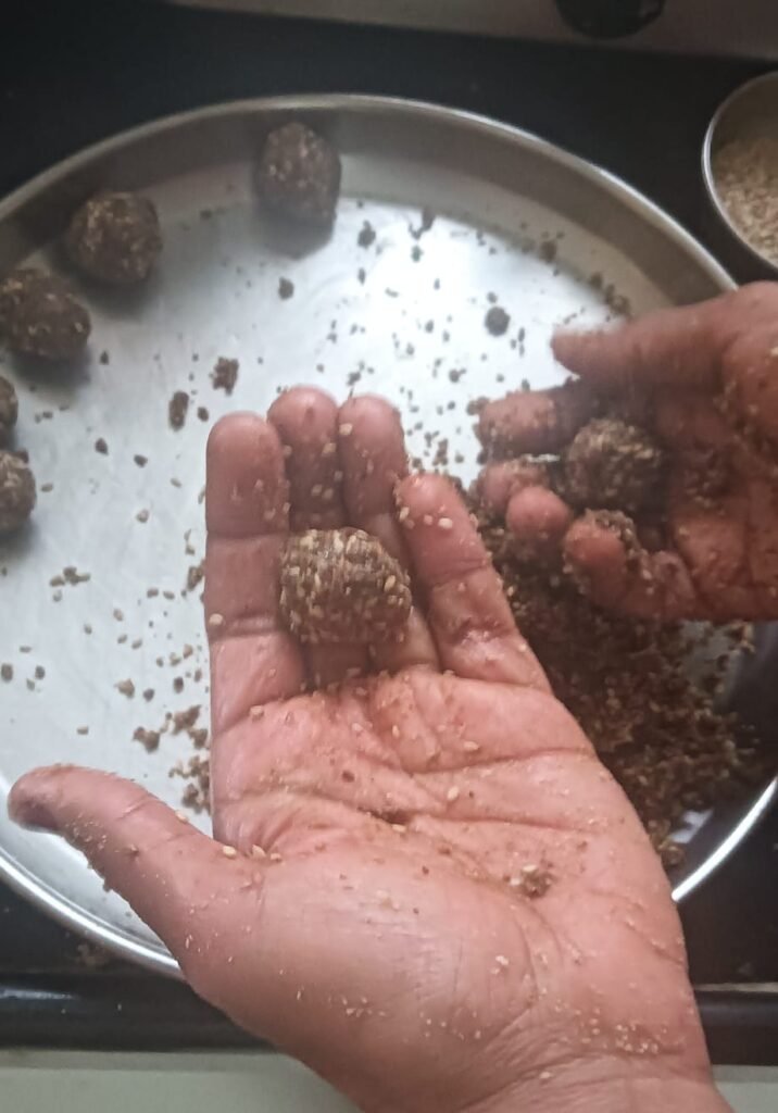 आता त्याचे लाडू वळून घ्या. आपल्याला जर त्यामध्ये तूप घालायचं नसेल जर लाडू वळत असल्यास डायरेक्ट पण लाडू वळले तरी चालतील.