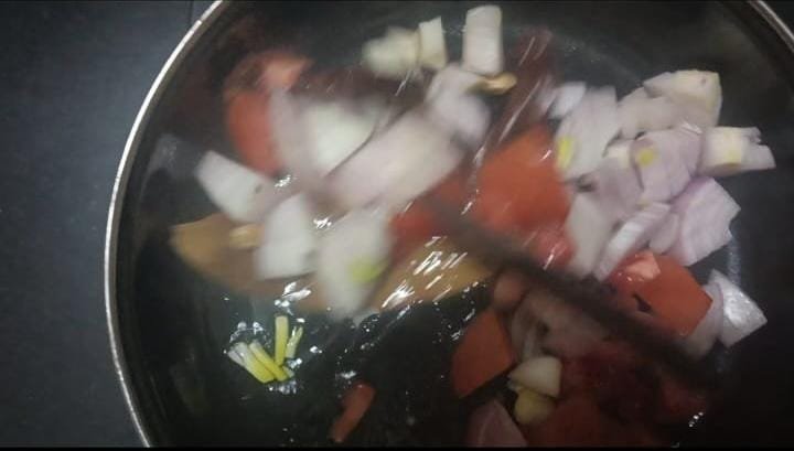 त्यात कांदा टोमॅटो लसूण पाकळ्या सात ते आठ काजू थोडे पाणी घालून परतून घ्या कांदा आणि टोमॅटो शिजेपर्यंत परतून घ्या.