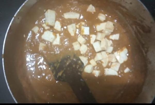 आणि परतवलेले पनीरचे तुकडे त्यामध्ये घालून परतून घ्या. याला दोन ते तीन उघड्या आल्यानंतर त्यावर चिरलेली कोथिंबीर घाला. पनीरचे तुकडे मी इथे परतवून घेतलेले आहे.