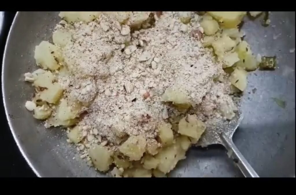त्यानंतर त्यामध्ये शेंगदाण्याचे कूट घाला. आणि पुन्हा दोन ते तीन मिनिटे भाजी चांगली खरपूस परतून घ्या.