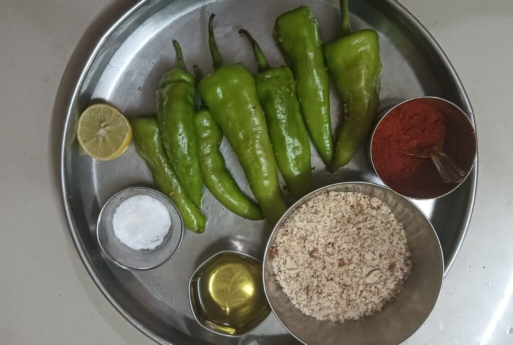 जेणेकरून त्यामुळे मिरच्या तिखट लागणार नाही… आता याला मधल्या बाजूने मिठ लावा. अर्धी वाटी शेंगदाणे चांगले खरपूस भाजून घ्या.