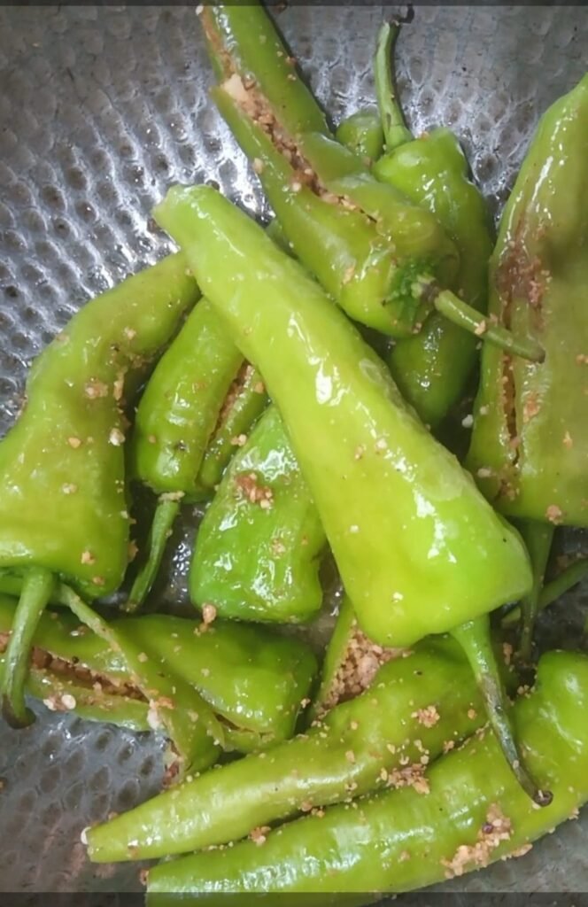 त्यावर साधारण पाच मिनिटे झाकण ठेवा मिरच्या वाफवून जातील. मिरच्या चांगल्या खरपूस फ्राय झाल्या की मग त्या दुसऱ्या बाजूने पलटी करून घ्या .