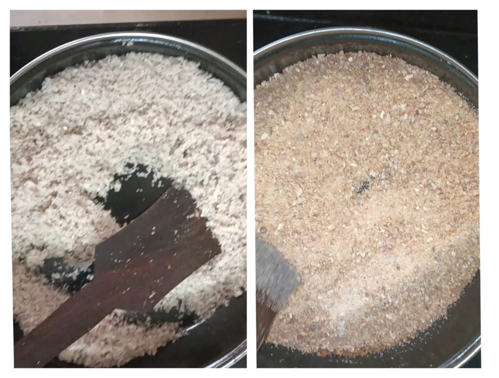 या पद्धतीने सर्व अर्धा किलो खोबरे परतून घ्या. ते का मिश्रण एका तगारी मध्ये काढा. आता एक चमचा तूप घाला आणि त्यामध्ये खारीक पावडर परतवून घ्या .