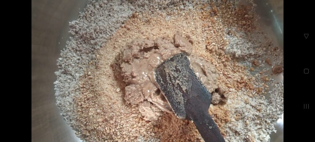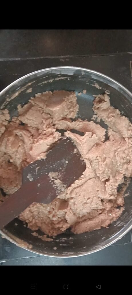 आता हे मिश्रण व्यवस्थित मिक्स करून घ्या… मिक्स केल्यानंतर त्याचा लाडू होतो का ते बघा. लाडू होत नसल्यास पॅनमध्ये दोन ते तीन चमचे तूप वितळवून घ्या.